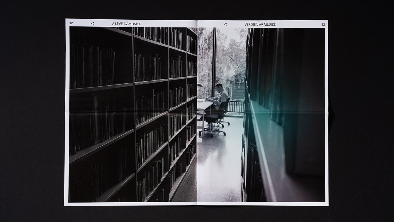The logo of Verdien av musikk is the symbol of a crescendo, a concept of music that describes a gradually increasing volume. This symbol also refers to the letter V in Verdien av musikk. The use of a single letter as a logo we also find in Gramo and TONO's individual identities.