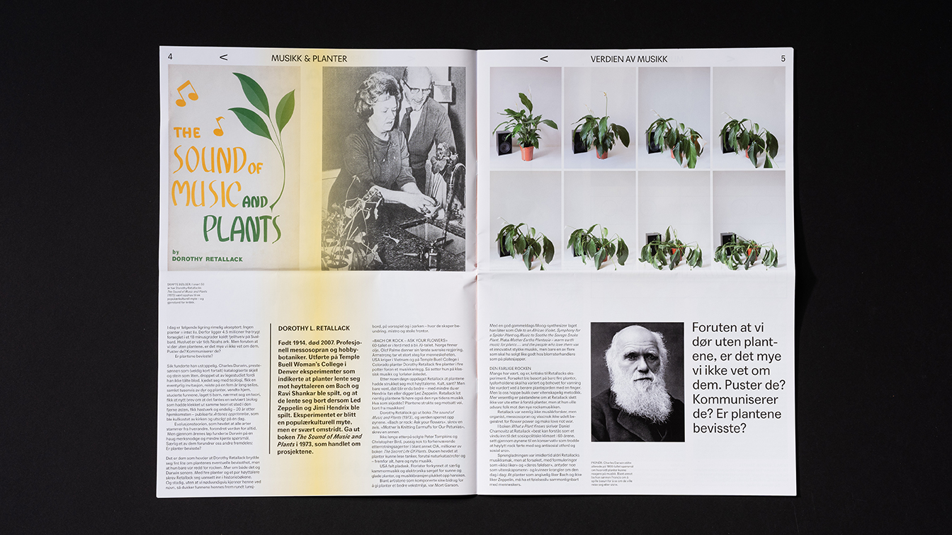 Through editorial stories, the recipient gained insight and inspiration to look at music from new and often surprising angles. For example, music is actively used in the treatment of Alzheimer's, where a song can act as a catalyst for forgotten memories. Of other relevant stories, the research project of Dorothy L. Retallack from the early 70's can be mentioned. Her ambition was to prove that plants react differently to different genres of music.